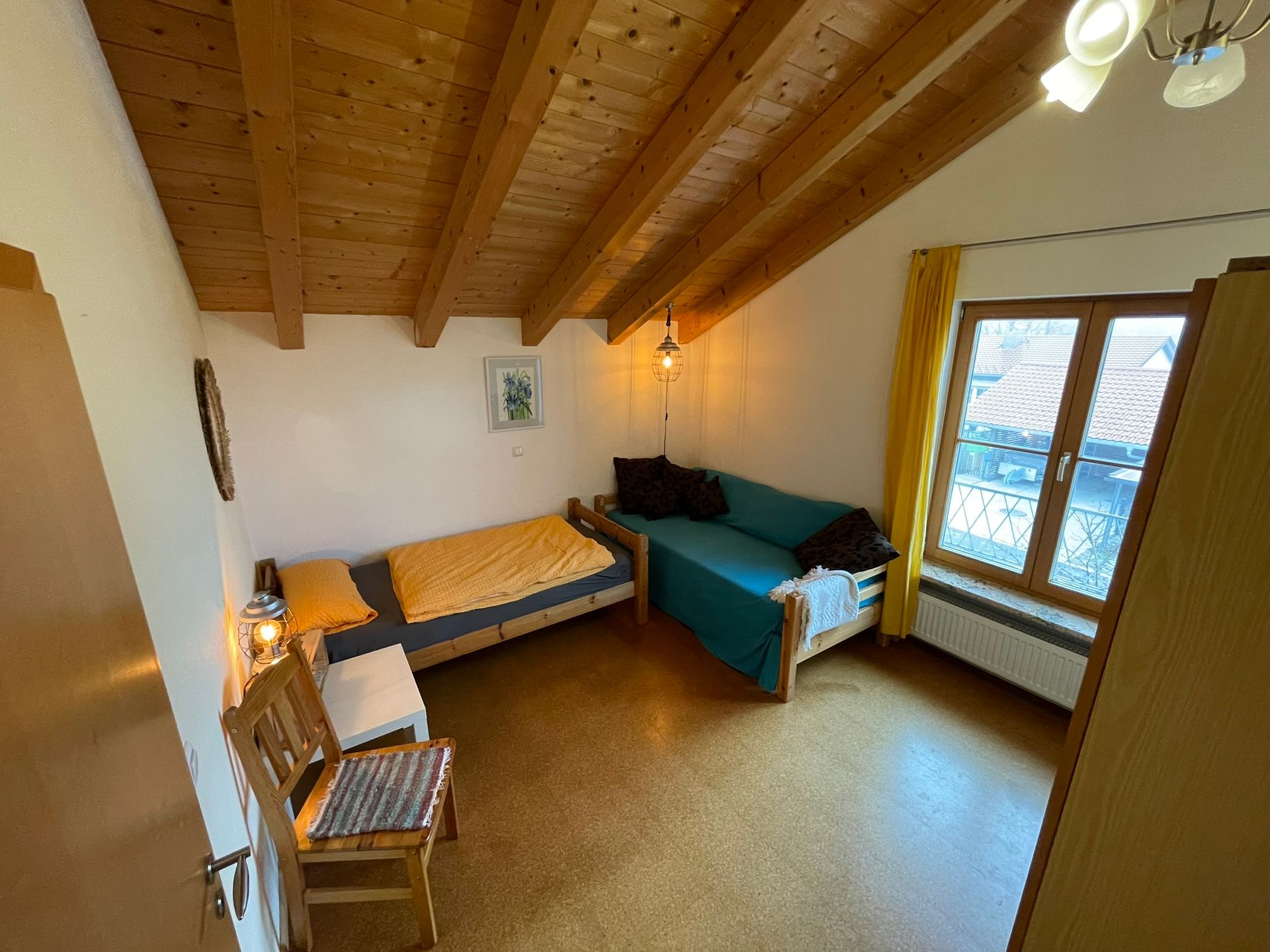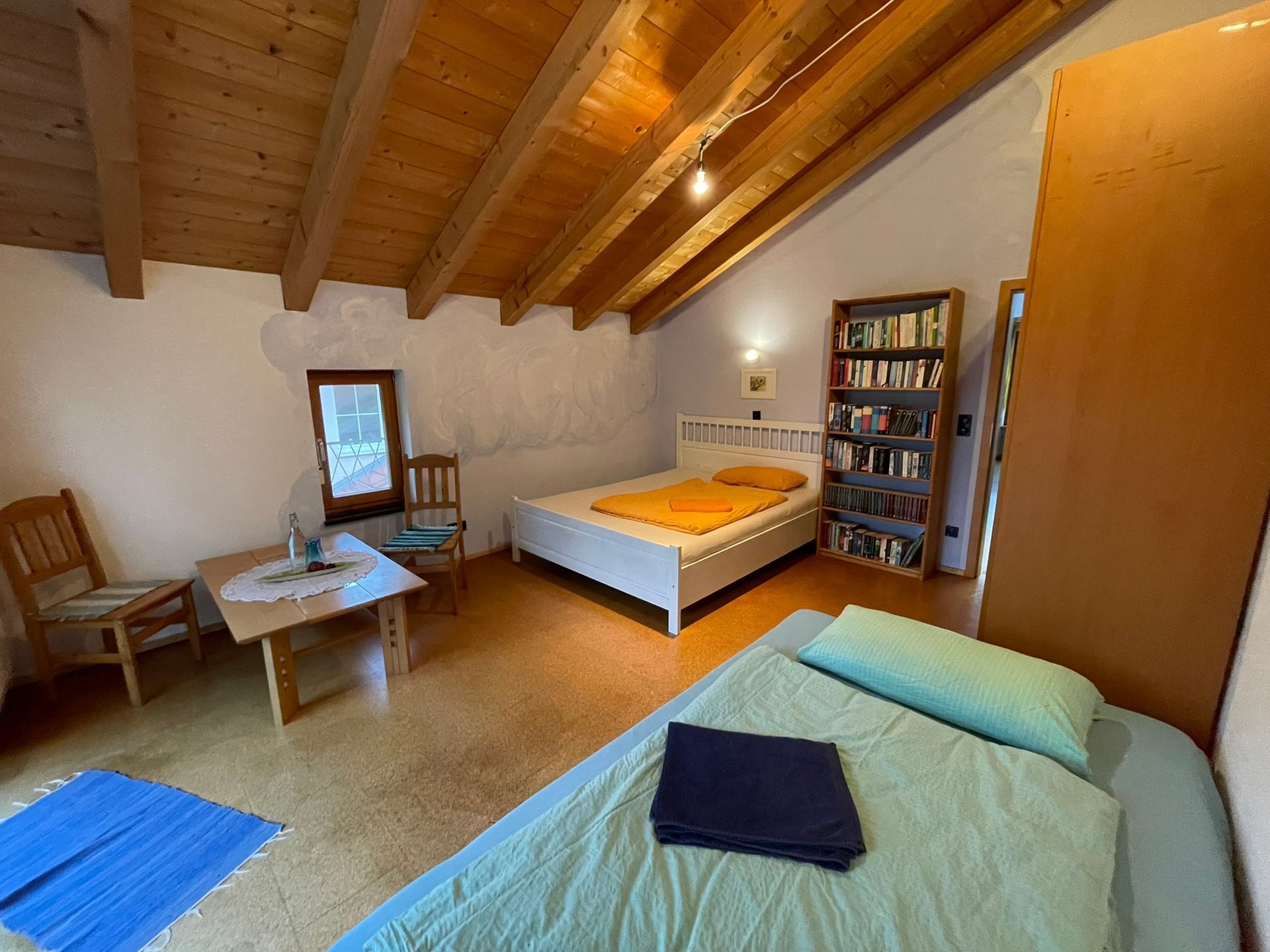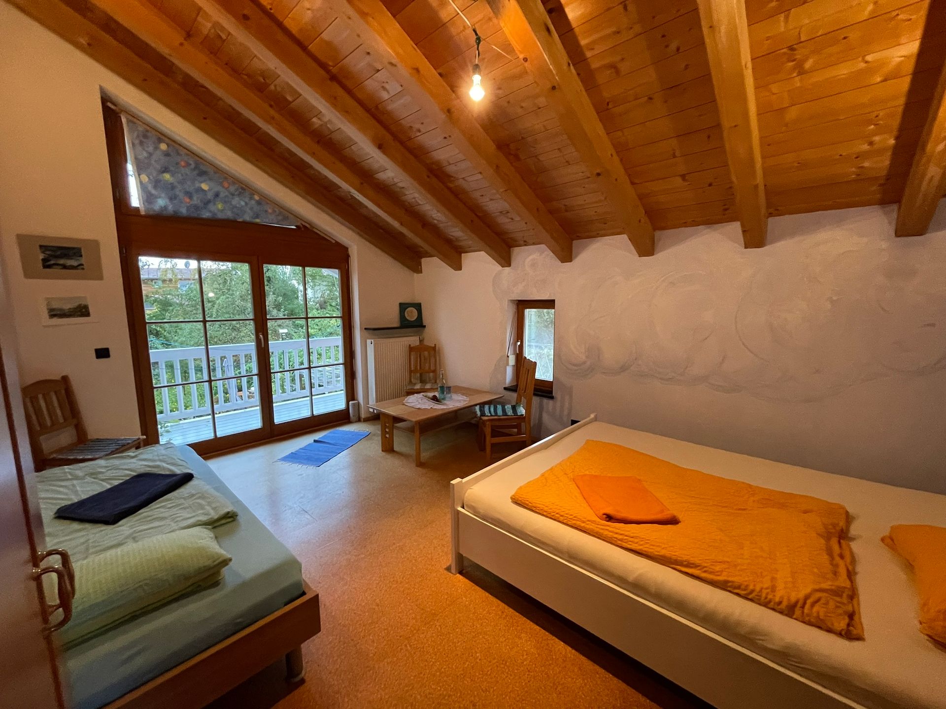 Das "Blaue Zimmer" liegt zum Garten raus, ist 20m2 groß und hat Zugang zum Balkon. Man schläft in einem 1,40m breiten Doppelbett mit zwei Matratzen sowie in einem Einzelbett. Zusätzlich können wir wahlweise ein Feldbett, ein Baby-Bett oder eine hochwertige Luftmatratze zur Verfügung stellen.